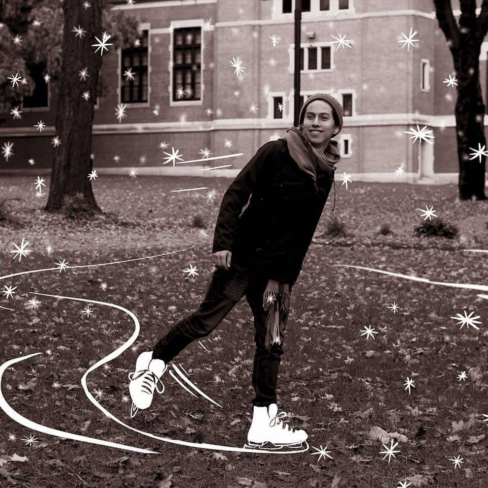 Combining high-def photos with rough, hand-drawn illustrations and simple animations made it possible to showcase iconic parts of campus while adding a fun, light-hearted element that fit the festive holiday spirit. An additional challenge we worked through was having to create convincing winter scenarios in the middle of fall (if you look closely, you can still see the leaves on the ground!)